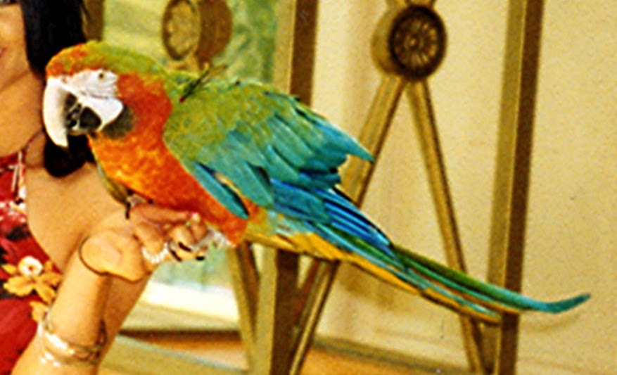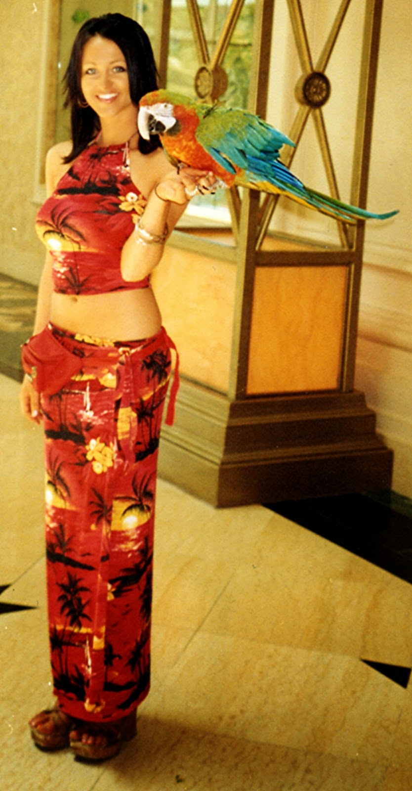 In 2004, while visiting the Mandalay Bay Hotel (since renamed the Delano Las Vegas) on the Strip in Las Vegas, Nevada, I saw and photographed a very beautiful macaw (with its equally glamorous handler!). It reminded me of various hybrid macaws that I had previously seen in photos in books, so I naturally assumed that I'd soon be able to identify it once I was back home (when photographing the macaw with its handler, it never occurred to me to enquire about the identity of her macaw, as my concentration seemed to be a little distracted - can't think why!! lol).