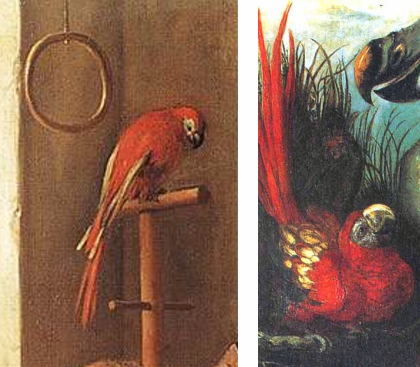 Close-up comparison of the red mystery macaw in Jan Steen's painting (on left) and the red mystery macaw in Roelandt Savery's dodo painting (on right)A century and a half earlier, this still-unidentified but now long-vanished parrot form had also been observed there by Christopher Columbus's landing party, who claimed that it was as big as a chicken (which certain species of macaw are indeed). Could some specimens of Guadeloupe's red parrots have been brought back to Holland by travellers sometime after Columbus's time, upon which the mystery red parrots in the paintings by Savery and Steen were duly based, either independently or with Steen's being inspired by Savery's? Who can say for certain?