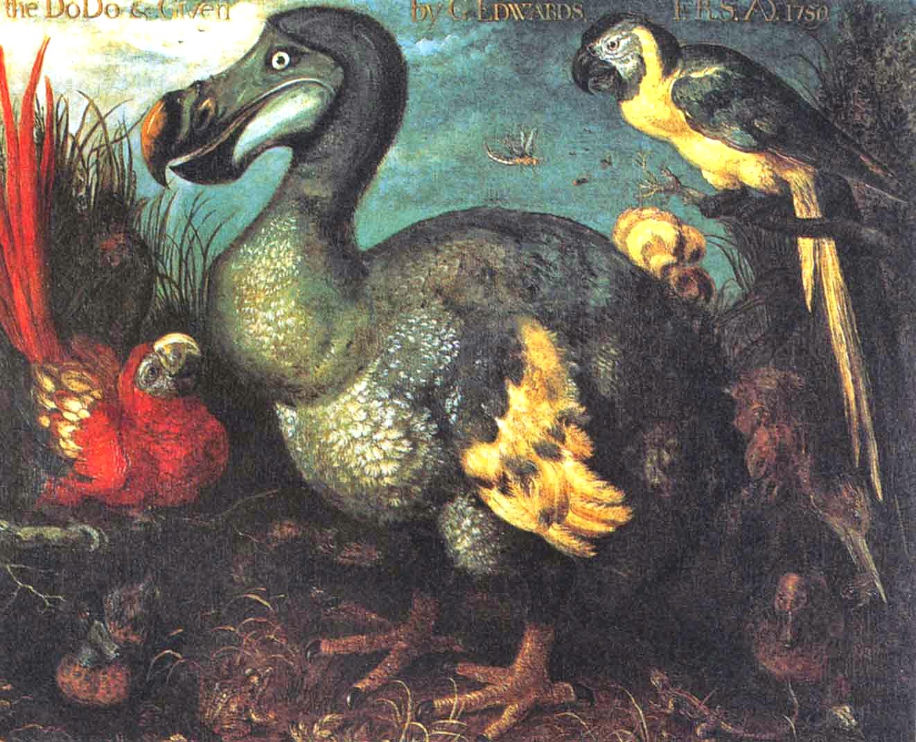 Roelandt Savery's 1626 dodo painting, featuring the red mystery macaw on the left (click picture to enlarge it)Both macaws have pale wing plumes but otherwise uniformly red plumage. Yet although no living species of macaw corresponds with such birds, they readily recall an account penned during the 1650s by French missionary Jean-Baptiste Du Tertre of a very large, almost entirely red parrot native to the Caribbean island of Guadeloupe.