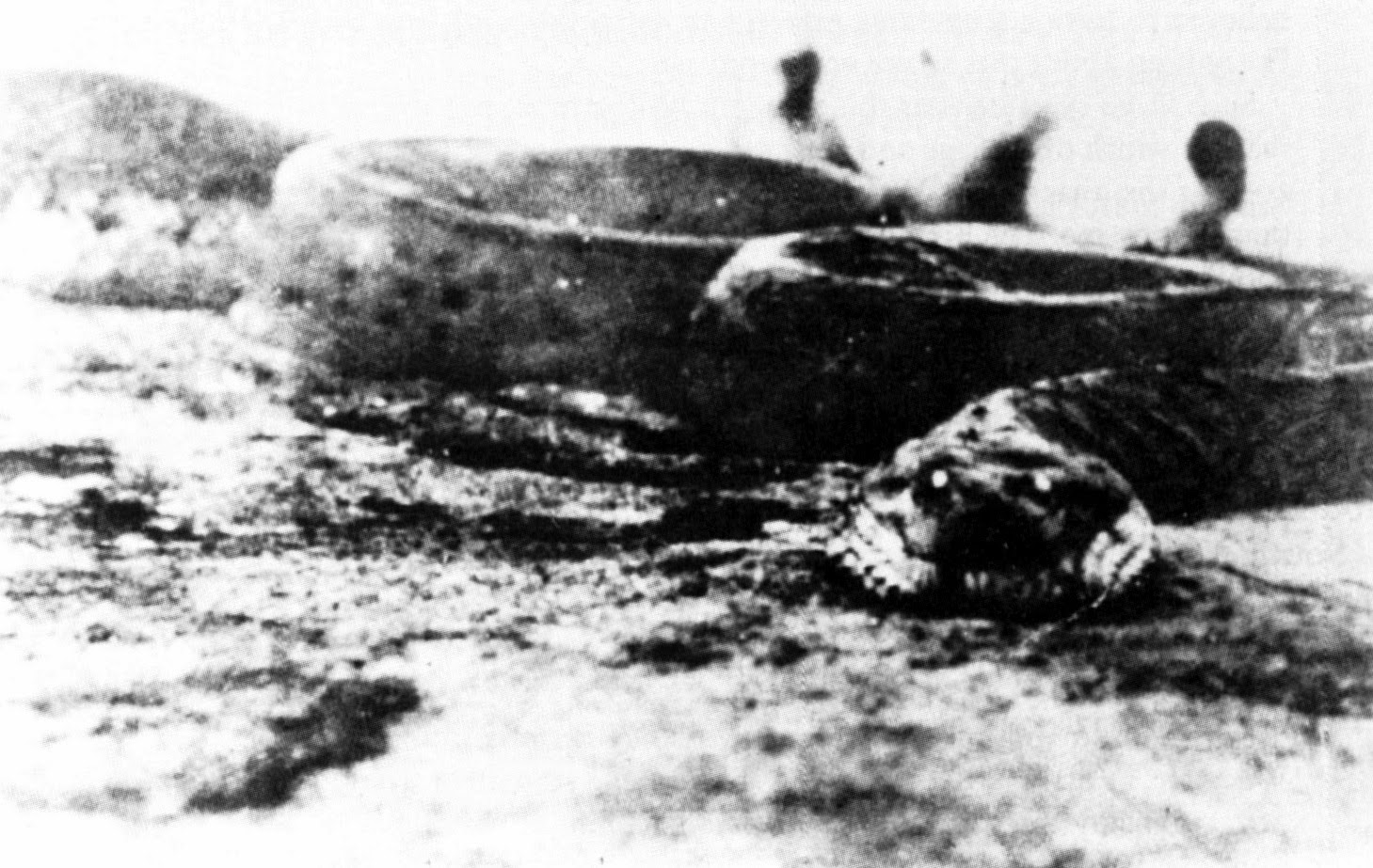 Illustration of a giant anaconda coming ashore (William Rebsamen)The following photograph depicts an alleged 40-45-m-long sucuriju gigante that according to Tim Dinsdale's book The Leviathans (1966) was originally captured alive on the banks of the Amazon and towed into Manaos by a river tug before being subsequently dispatched via a round of machine-gun fire – but does the photo depict a genuine giant anaconda, or just a well-executed hoax involving forced perspective? The question remains unanswered.