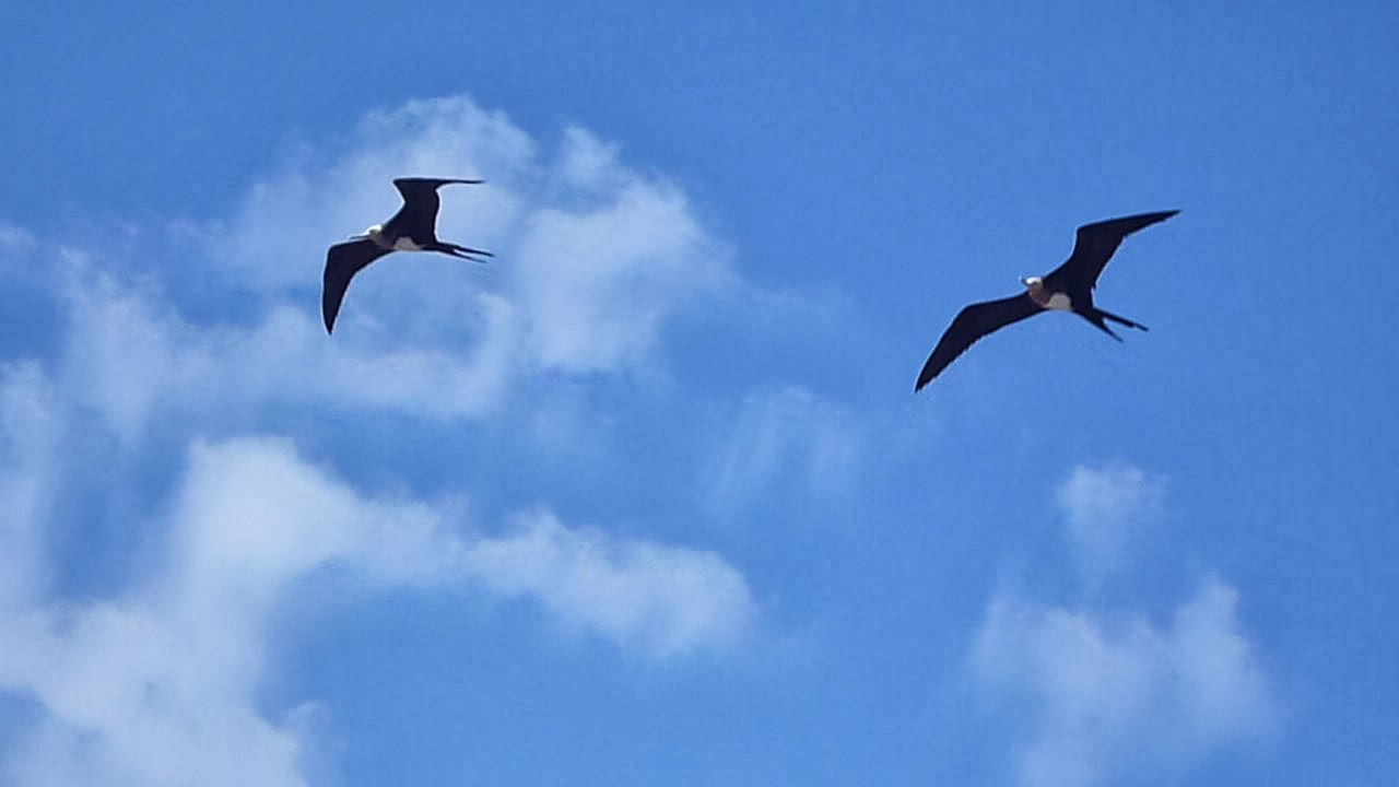 Magnificent frigate birds in flight (David Adam Kess/Wikipedia)These long, angular-winged relatives of pelicans do appear positively primeval on first sight, and might well deceive ornithologically-untrained eyes into believing that they had truly witnessed a phalanx of flying reptiles from the ancient past.