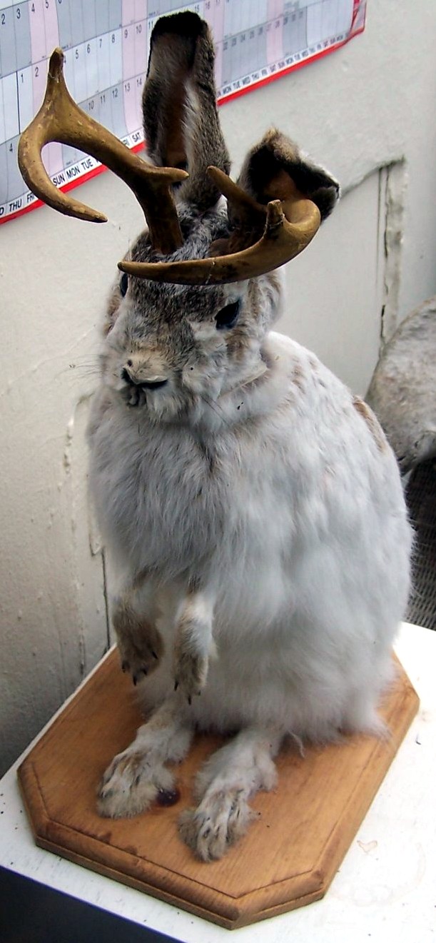 By the 19th Century, conversely, advances in zoological research and scientific knowledge had shown that the horned hare was not only a nonsense but a fraudulent one. Close examination of the taxiderm specimens revealed that they were hoaxes, created by the skilful manipulation of large stuffed rabbits or hares onto whose heads had been craftily grafted pairs of young, short deer antlers, or, more rarely, the trimmed, pointed horns of small African antelopes, particularly duikers.