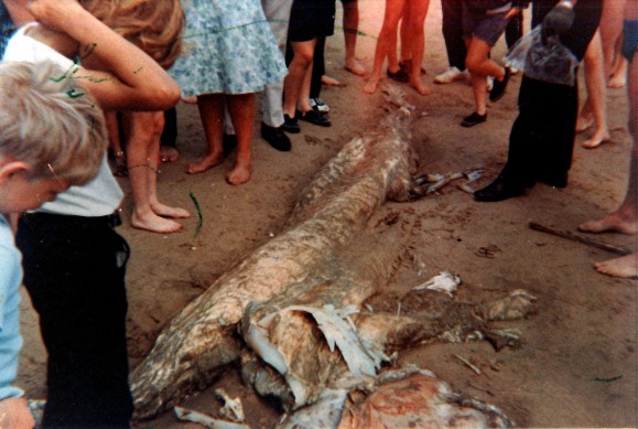 "The enclosed photographs were taken in 1976 and I was wondering if the creature was a form of shark. It was washed up on the beach, it had a form of scales on the body and seemed like feathers on the neck – the head was only bone and gristle, the tail was long, similar to a crocodile with (which seemed) elephant hair at the base of the tail. It must have been damaged by a boat because the lungs were spread out on the beach (as seen in photo. It had flippers and feet, and was pregnant."