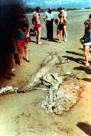 Photograph #1 - Kent sea monster carcase 1976, with pseudo-plesiosaur portion above mini-globster portion (Juliet Lilienthal)Sea monsters can be very deceiving, even when dead. For example, it is well known, especially in cryptozoological circles, that the decomposing carcase of a beached basking shark Cetorhinus maximus often transforms very dramatically, and deceptively, to yield what on first sight looks remarkably like a long-necked, four-flippered, slender-tailed, hairy plesiosaur-like creature. This is the so-called pseudo-plesiosaur effect, in which the jaw and sizeable gill apparatus fall away, revealing a lengthy portion of vertebral column that superficially resembles an elongate neck, coupled with the shark's dried-out pectoral and pelvic fins looking like flippers, its lower tail fin dropping off, and its skin's exposed collagenous connective fibres gaining the appearance of thick fur.
