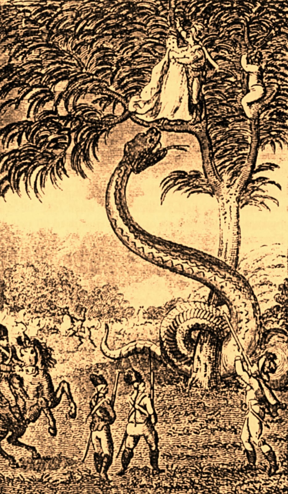 Frontispiece to garrison deserter John Browne's Affecting Narrative book from 1802, depicting an 'ibibaboka' - clearly a grossly-exaggerated anaconda yet supposedly encountered by him in 1799 on St Helena!Even prehistory – a domain replete with reptilian giants - once offered little support for serpent monsters. Traditionally, the largest species of fossil snake on record has been North Africa's Gigantophis garstini, which existed approximately 40 million years ago and was believed to measure more than 10 m but not to exceed the minimum length needed to claim the Bronx Zoo's longstanding prize. And then along came Titanoboa.
