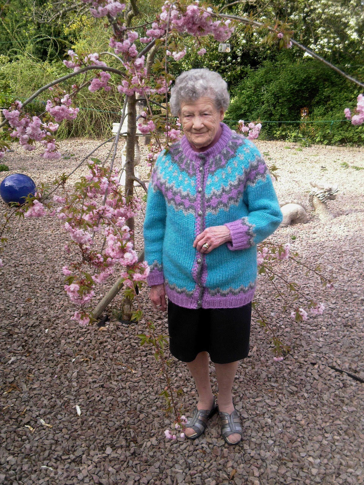 Mom wearing her exquisite protea-decorated jacket from Cape Town, South Africa (Dr Karl Shuker)