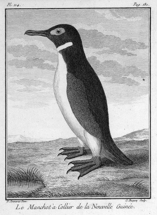 Pierre Sonnerat was also an artist and a writer, and his publications include Voyage à la Nouvelle-Guinée (1776), documenting an expedition that he claimed to have made to the Spice Islands (now called the Moluccas) and New Guinea in 1771. From an ornithological standpoint, this publication is particularly intriguing, inasmuch as it reports the presence in New Guinea of no less than three species of penguin as well as the common kookaburra or laughing jackass Dacelo novaeguineae. His book even contains illustrations signed by him that depict the penguins as well as the kookaburra, and the brief passage in it concerning the penguins states: