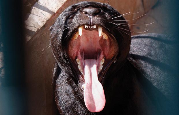 Photograph of a yawning black leopard for comparison purposes (Associated Press/London Daily Telegraph)I posted enquiries concerning the photo on Facebook, and received many suggestions from a number of FB friends, some of whom even attempted to contact the Preserve directly via phone using the phone number on its website, but the number was not currently in use, and there is no email contact address either. Its website's information does include mention of normal pumas maintained there, but nothing whatsoever about any black or dark puma, which, as already noted, would certainly be expected if so rare and exotic a felid as that were truly present there.