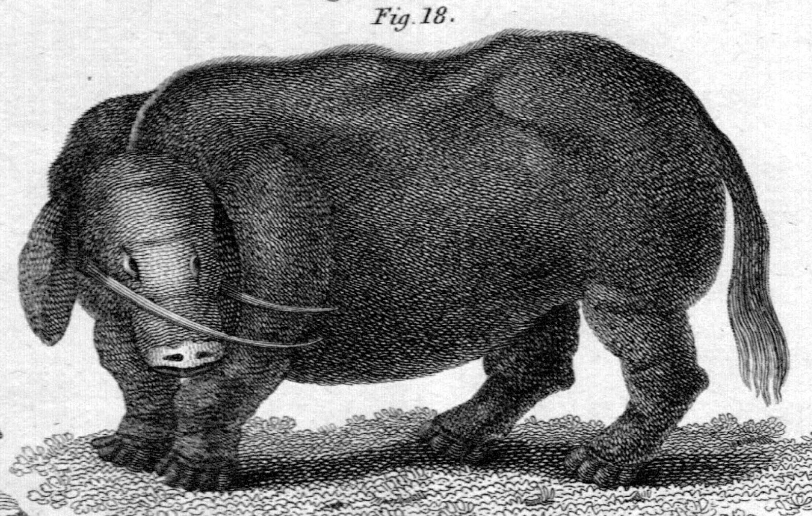 "That we may not seem to neglect so remarkable an animal, though hitherto so very imperfectly known, we shall here introduce the Sukotyro. This, according to Niewhoff, its only describer, and who has figured it in his travels to the East Indies [Die Gesantschaft der Ost-Indischen Gesellschaft in den Vereinigten Niederländern, 1669, containing the original illustration reproduced above], is a quadruped of a very singular shape. Its size is that of a large ox: the snout like that of a hog: the ears long and rough; and the tail thick and bushy. The eyes are placed upright in the head, quite differently from those of other quadrupeds. On each side the head, next to the eyes, stand the horns, or rather teeth, not quite so thick as those of an Elephant. This animal feeds upon herbage, and is but seldom taken. It is a native of Java, and is called by the Chinese Sukotyro. This is all the description given by Niewhoff. The figure is repeated in Churchill’s Collection of Voyages and Travels, vol. 2. p. 360. Niewhoff was a Dutch traveller, who visited the East Indies about the middle of the last century, viz. about the year 1563 [sic – should be 1653], and continued his peregrinations for several years. It must be confessed that some of the figures introduced into his works are not remarkable for their accuracy."