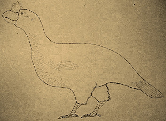 Their ancestors called it the du, and described it as a huge, aggressive bird with red plumage and a star-shaped bony casque on its head. Although unable to fly, it could run very swiftly, usually with its wings outstretched. It laid a single egg, which took four months to hatch (from November's close to April's onset), but it did not incubate the egg itself.