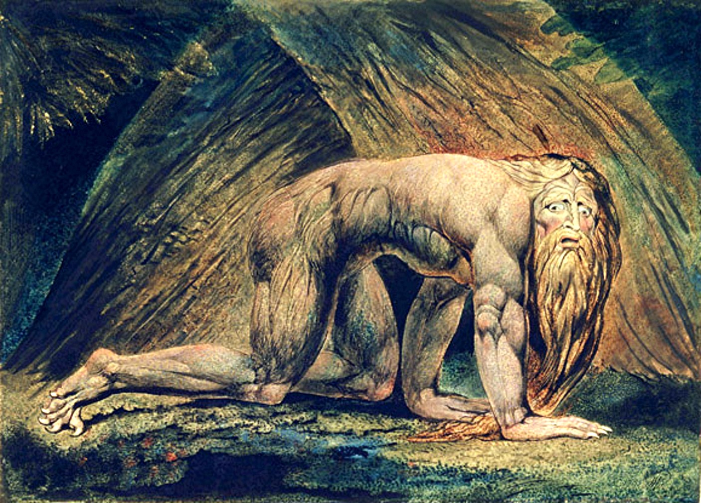 William Blake's famous depiction of Nebuchadnezzar in the wilderness (1795)During the Middle Ages, insane people or simpletons were sometimes released into the wilderness to fend for themselves, so that they became little more than wild beasts. According to the Holy Bible’s Book of Daniel, moreover, the once-mighty Babylonian king Nebuchadnezzar II underwent a seven-year period of madness during which time he lived alone in the wild, crawling on all fours eating grass, and allowing his hair and nails to grow unchecked until he resembled a man-beast instead of a man.
