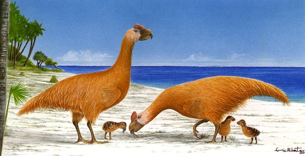 Magnificent painting of a Sylviornis family (© Éric Alibert)The dimensions of this vanished bird's remains have shown that it was as large as the modern-day emu (5-6 ft tall), and flightless. Indeed, after studying the bones, in 1980 Poplin published a scientific description of this dramatic species (Comptes Rendus), named by him Sylviornis neocaledoniae, in which he announced that, like the emu, it too may have been a ratite – i.e. one of those widely-dispersed species of giant flightless bird that also include the ostrich, rheas, and cassowaries, as well as the extinct moas, and elephant birds.