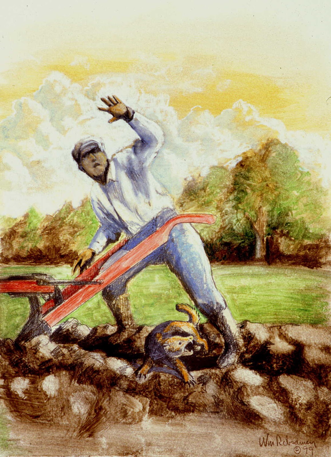 Depiction of the fraught encounter by Archibald's father with an earth hound (William Rebsamen)Worth noting here is that the field being ploughed when this particular earth hound had been uncovered was very close to a churchyard – indeed, this churchyard was later abandoned due to the firmly-held belief that it was infested with these creatures. It was also believed that earth hounds always lived close to water, and constructed their nests in haughs (stretches of river-deposited land forming part of river valleys).