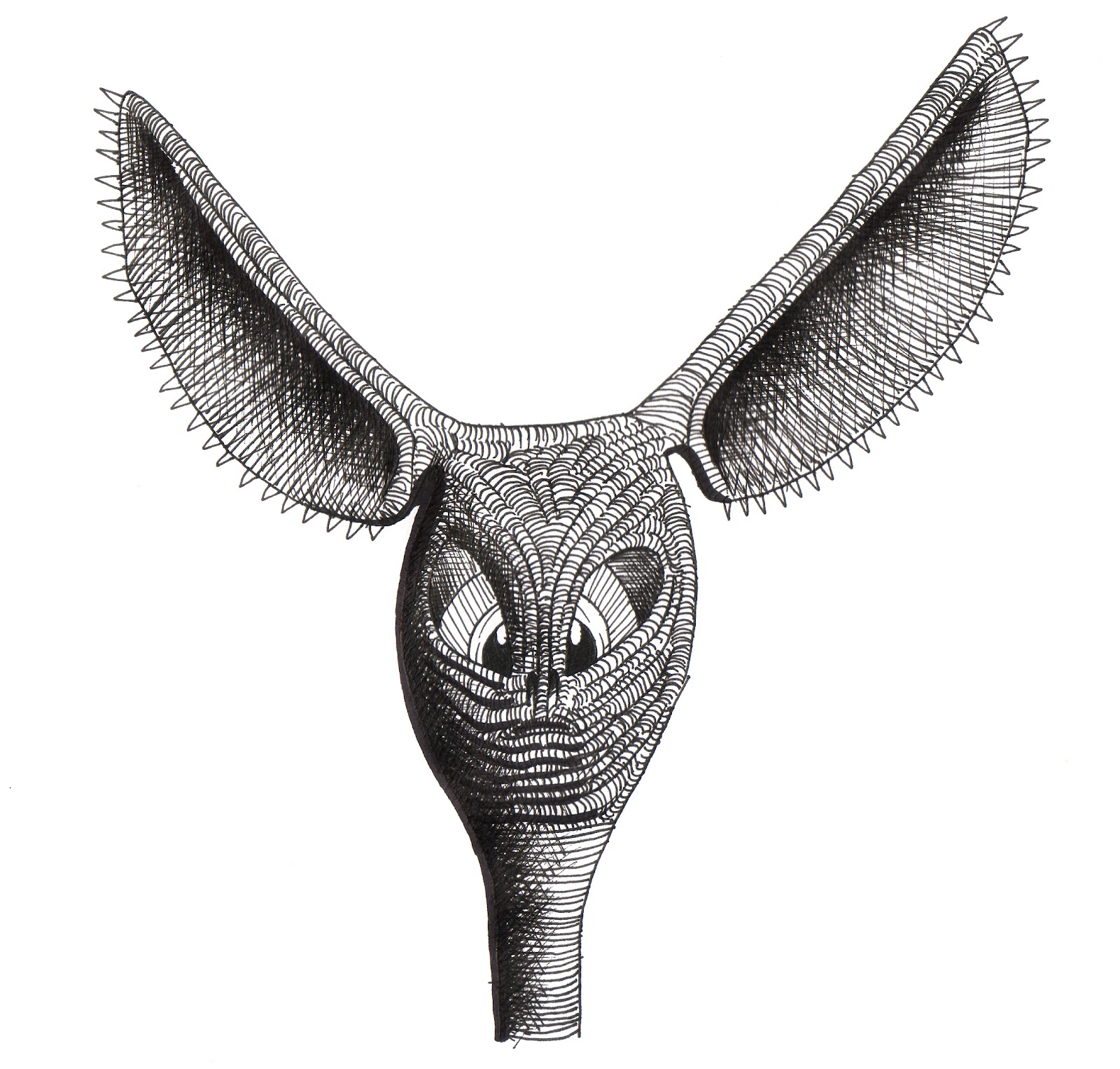 Imagine a 5-ft-tall, neck-less, humanoid figure resembling an Egyptian mummy, with grey wrinkled skin of elephantine appearance and texture, a pair of disproportionately long arms whose hands resembled mittens (i.e. with a single thumb but no differentiated fingers), a pair of legs held together like a pedestal and terminating in two bulbous elephant-like feet, and a seemingly eyeless face sporting a pair of pointed retractile ears, a conical nose-like structure, a short slit of a mouth that never opens, and a terrifyingly blank expression.