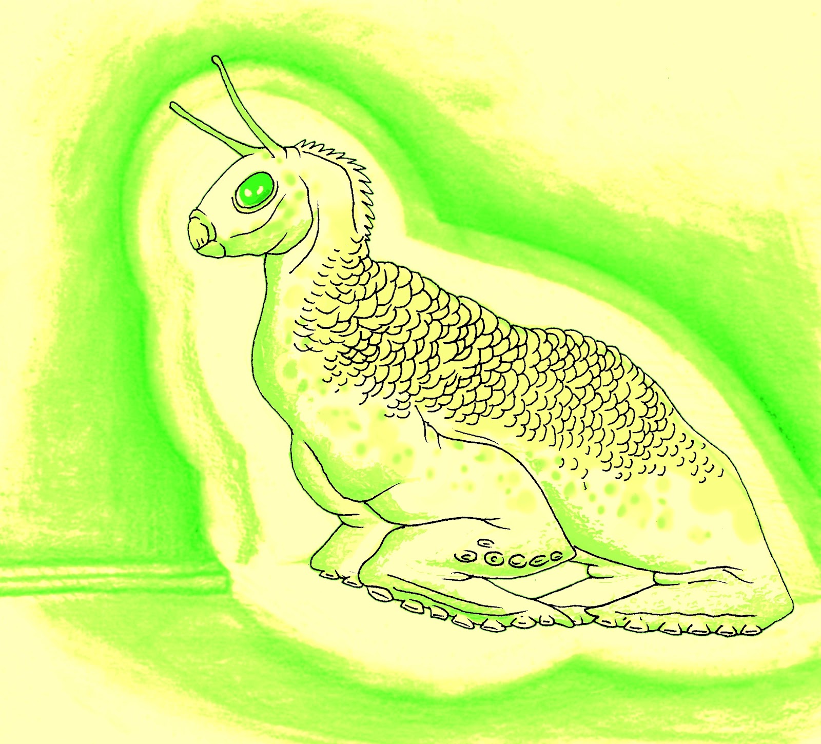"...it was horse-sized, covered with scales and standing on four rubbery legs with suckers like octopus tentacles. Its head was football-shaped with an antenna sticking up...The thing gave off this green, iridescent light."