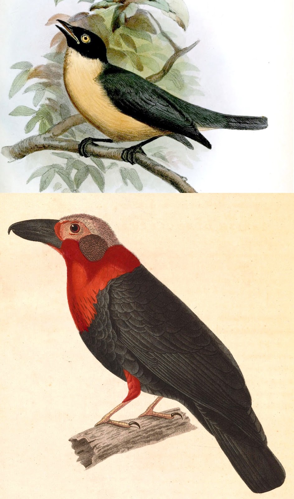 And now to the second member of this ShukerNature post's pair of mainstream mystery birds: the Bornean bristle-head. This distinctive species was formally described even earlier than the kinkimavo, in 1835 by eminent Dutch zoologist Coenraad Jacob Temminck, who named it Barita gymnocephala. Four years later, it was assigned its own genus by French ornithologist René Primevère Lesson, and is now known formally as Pityriasis gymnocephala. Its generic name is actually a skin disease of the scalp, characterised by warts upon a bald head, and its specific name translates as 'bald-headed'; both names refer to this bird's partly-naked, warty-skinned head and the unusual but characteristic bristles borne upon it (see below).