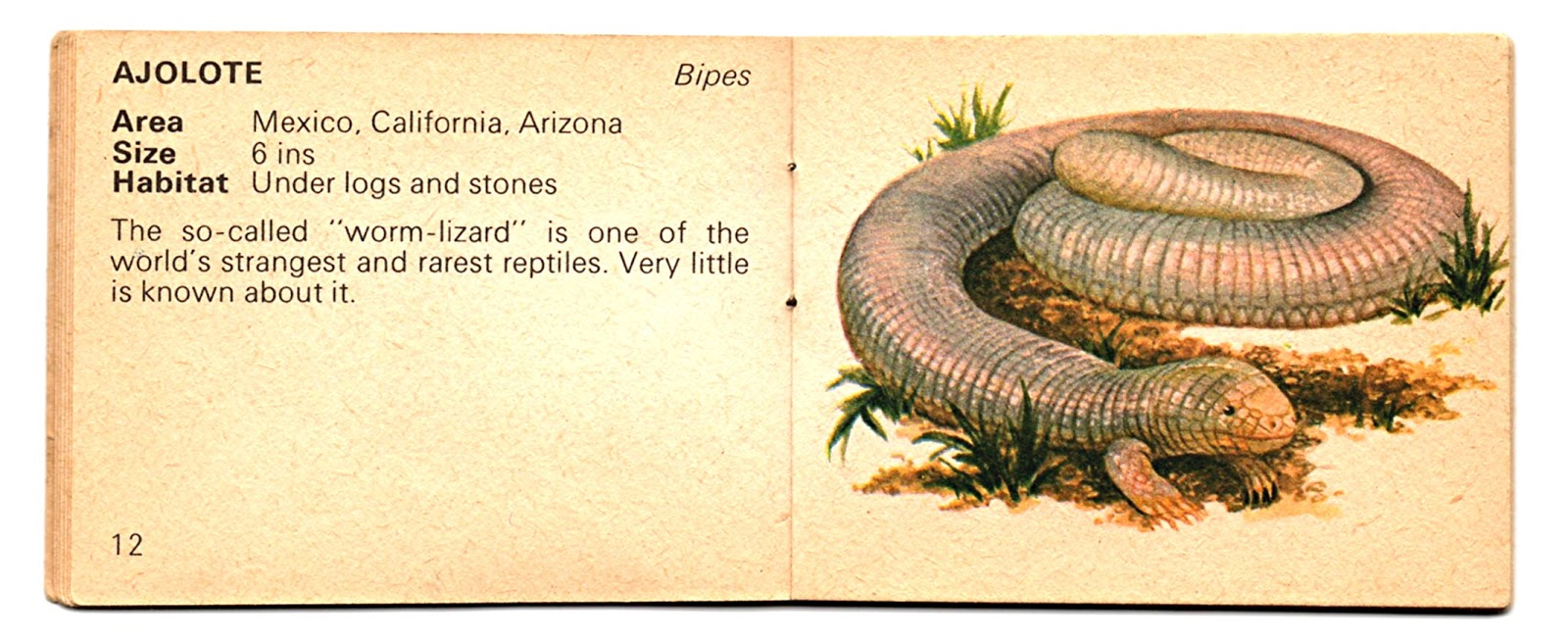 The ajolote spread from Freaks of NatureThis vermiform 'freak of nature' (which one might be forgiven nowadays for dismissing as an imaginative Photoshopped creation!) also appeared inside the book. There, it was revealed to be something called an ajolote, with the generic name Bipes (translating as 'two-footed'), which was a worm-lizard from Mexico. As can be seen from the above image, little else was said about it inside my 'Bancroft Tiddler', but it was enough to fire my interest and imagination, and stimulate me to seek out additional information concerning this astonishing little animal.