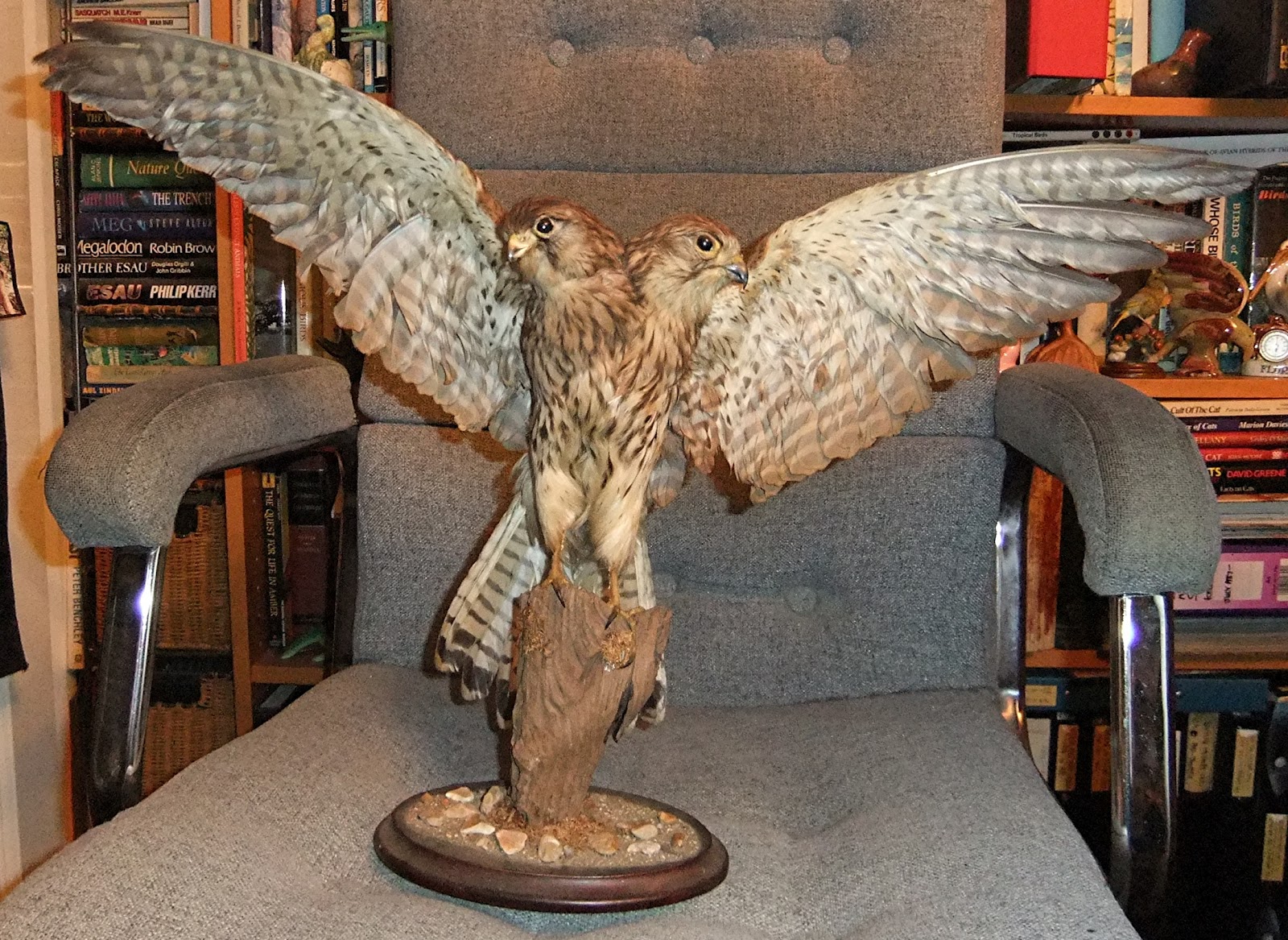 Silent testimony to the art of the expert taxidermist, it astonished and entranced all who viewed it, until eventually, along with most of his other specimens, Nigel sold it several years ago. Only then did he confess the truth to me – it was a fraud, albeit a truly amazing one. The left head was from another specimen entirely, which the taxidermist had meticulously attached to an already-prepared stuffed kestrel from Victorian times, to create this twin-headed falcon.