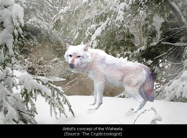In general appearance, the waheela allegedly resembles a huge snow-white wolf, but its head is proportionately wider and its limbs shorter, its coat is notably long and dense, its feet are very splayed, its ears are surprisingly small, and its tail is extremely thick. In addition, whereas true wolves hunt in packs, waheelas are solitary creatures.