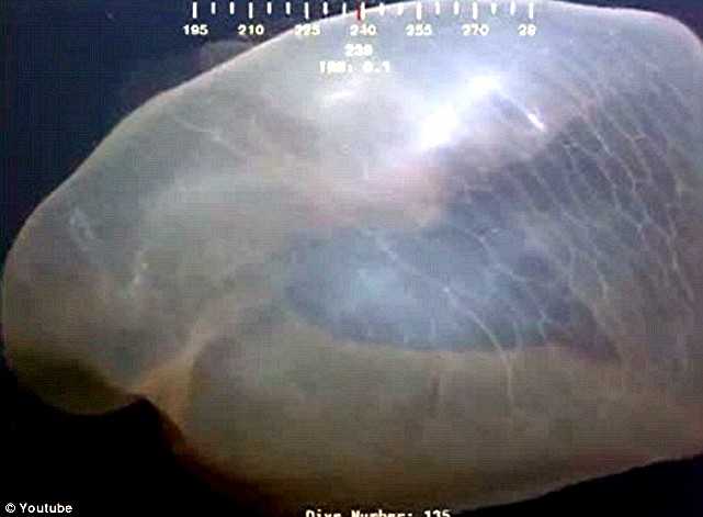 Deepstaria enigmatica, a bizarre, flattened species of deep-sea jellyfish (http://2.bp.blogspot.com)Deep-sea jellyfishes similar (though not identical) to the above-described creature encountered by the diver may explain Chilean legends of a grotesque sea monster termed the hide, documented by Jorge Luis Borges in his famous work The Book of Imaginary Beings (1969). According to Borges, the hide is an octopus that resembles in shape and size a cowhide stretched out flat, with countless eyes all round its body's perimeter, and four larger ones in the centre. It lives by rising to the surface of the sea and swallowing any animals, or people, swimming there.