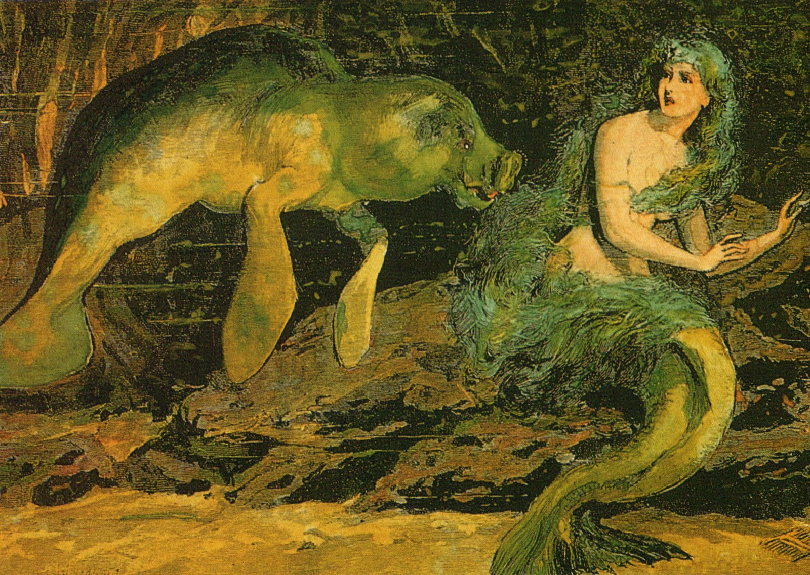 "A Welsh farmer, named Reynolds, living at Pen-y-hold in 1782, saw a something which he appears to have believed to be a mermaid; he told the story to Dr. George Phillips, who told it to Mrs. Moore, who told it to a young lady pupil of hers, who wrote out an account of it to Mrs. Morgan, who inserted it in her "Tour to Milford Haven." How much...[it] gained on its travels - like the Three Black Crows or the parlor game of Russian Scandal - we are left to find out for ourselves; but its ultimate form was nearly as follows: One morning, just outside the cliff, Reynolds saw what seemed to him to be a person bathing in the sea, with the upper part of the body out of the water. On nearer view, it looked like the upper part of a person in a tub, a youth, say of sixteen or eighteen years of age, with nice white skin!, a sort of brownish body, and a tail was under the water. The head and body were human in form, but the arms and hands thick in proportion to length, while the nose, seeming up high between the eyes, terminated rather sharply. The mysterious being looked attentively at Reynolds, and at the cliffs, and at the birds flying in the air, with a wild gaze, but uttered no...[sound]. Reynolds went to bring some companions to see the merman or mermaid, but when he returned it had disappeared. If we like to suppose that Reynolds had seen some kind of seal, and that the narration had grown to something else by repeating freely mouth to mouth, perhaps we shall not be very far wrong."