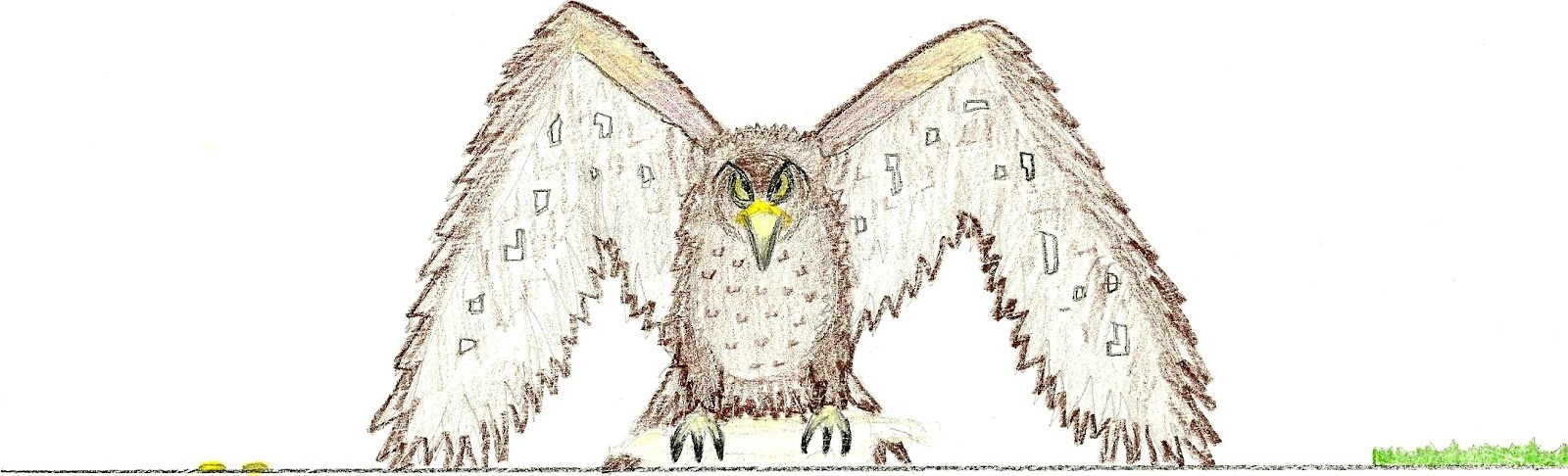 "I wanted to thank you again for your interest in my encounter with a giant eagle type bird in SC in about 1990. Although I am not much of an artist, I took a shot at drawing what I saw that morning, and have enclosed the illustration with this correspondence. Albeit crude and somewhat primitive, it provides a visual aide. If the average picture is worth a thousand words, then this one ought to be worth a million. This is how the animal looked when it raised its head and looked at me, at which time I finally realized what I was looking at. The bird flared out his wings slightly and gave me a very intimidating glare, as if to say that the deer was his and he was ready to defend it. It was a very fierce and menacing look. Of particular interest was the very robust, stout girth of the body and the very wide stance. His right leg was on the deer’s neck and the left on the hind end. His eyes also seemed very large, even for such a large animal. The bird also had very noticeably large feet. I did not notice the great length of the beak until he turned. Here is a brief list of observable physical attributes.