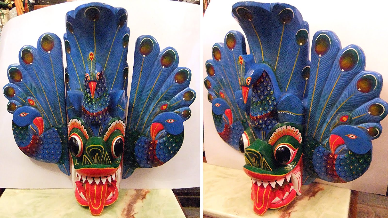 Two views of my peacock demon mask from Sri Lanka, via Birmingham! (Dr Karl Shuker)The mask depicts Maura Raksha, Sri Lanka's peacock demon, who brings peace, harmony, and prosperity, and is one of several demons whose masks are used in various types of traditional dance-based rituals (e.g. devil dancing, kolam dancing, sokari dancing). These masks are also widely seen at the main entrance of Sinhalese homes, to ward off evil influences and protect the householders, and they date back to pre-Buddhist times when Sri Lanka was an agricultural society.