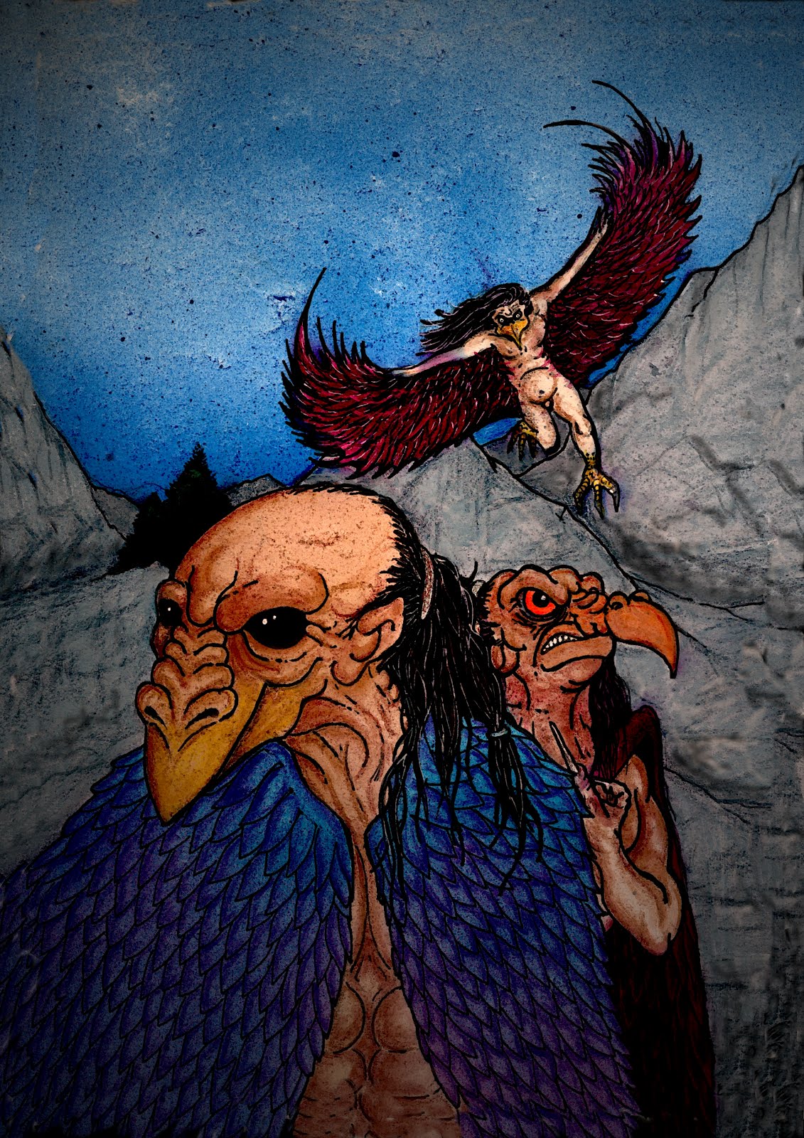 The priest’s eyes felt heavy and dim as he struggled to open them, as if they had been bound with a thousand cobwebs of deftly-spun silver. And there, standing before him, stood the tengu. Oh, he recognised it now, and as he looked at it, the tengu’s feathered ‘cloak’ unfurled, transforming into a pair of huge wings. It looked at the priest for a long, silent moment, then threw back its bald avian head, opened its sharp curved beak, and laughed – a terrible, screaming, heart-tearing sound that echoed through the clearing.