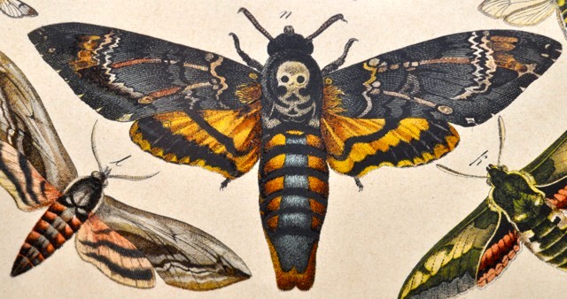 19th-Century colour engraving of the deathshead hawk moth"On the 4th of September [1883] one of these insects flew into a house near the Brunswick Brewery, Leeds. There was a sick child in the house at the time, and the mother, terrified at what she thought an evil omen, could not be pacified for some time. The insect was secured and taken to Wardman's, the bird-stuffer's."
