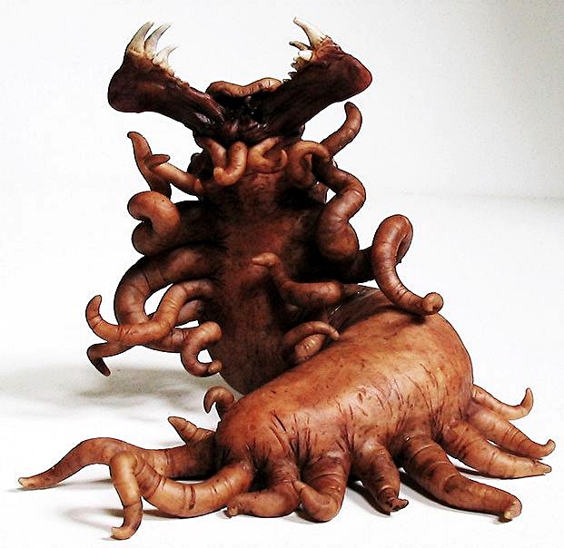 Swamp CritterNo less settling to the mind is what Andrew terms the Baby Deep One, because this is his concept of what H.P. Lovecraft's Deep Ones looked like as infants. Dorsally, it resembles a curled, gelatinous larva with little in the way of distinguishing features other than three short projections borne upon what appears to be this bizarre entity's neck region, and a pattern of short ridges running down its back. Turn it over, however, and you are met with a writhing mass of slimy tentacles, resembling a host of twisting, intertwined worms coated in glistening mucus. As with all of Andrew's sculptures, the technical accomplishment is dazzling – even the creature's slime looks ready to drip off its tentacles at any moment.