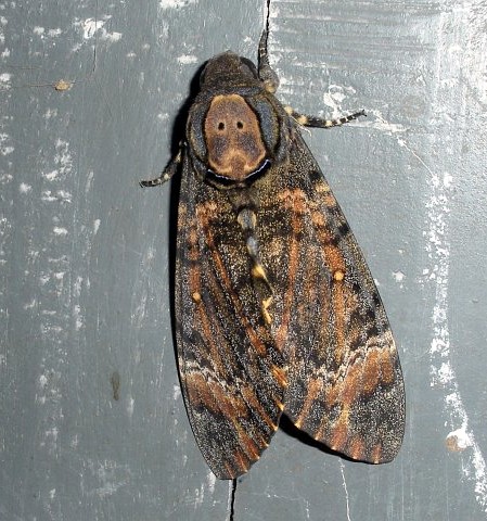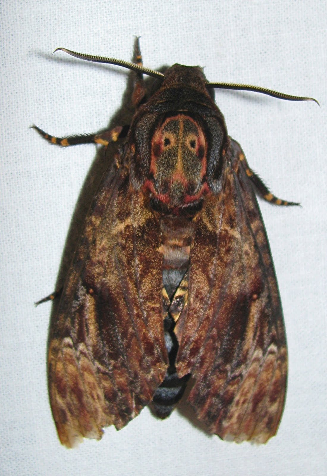 Pinned specimen of the deathshead hawk moth (Ivo Antušek/www.biolib.cz)This feature is a strange marking on top of its thorax's front portion, which, by a grotesque quirk of nature, forms a surprisingly realistic image of a human skull, ghostly white in colour with black, empty eyesockets. Enhancing this macabre image, the thoracic hairs bearing it are erectile, so that when they are raised up and down while the moth is resting, the 'skull' appears to be nodding!