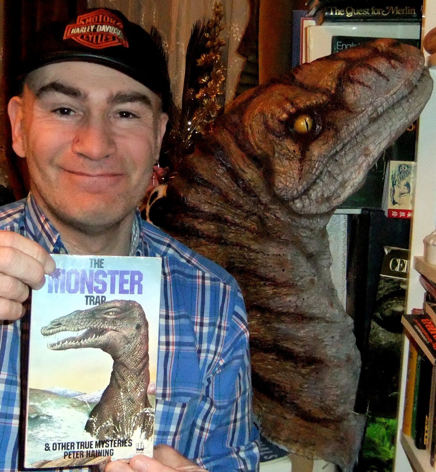 With my copy of The Monster Trap (and an interested Velociraptor looking on...) (Dr Karl Shuker)That same day, Trimble took his camera’s film to the local chemist shop for developing, and when he collected his photos two days later he was delighted to discover that although the picture snapped by him at the loch was slightly blurred, it did indeed depict the monster’s head and neck above the water surface. Consequently, that afternoon he penned an account of his sighting for London’s Times newspaper, enclosed with it a copy of his photograph, and posted it a few hours later. From then on, Trimble visited the loch daily, in the hope of seeing and photographing the monster again, but leaving Bruce at home to ensure that he didn’t cause any disturbance this time if the monster should reappear.