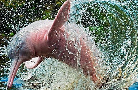 The stranger turned away, and, to Maria’s surprise, uttered a very rapid, high-pitched series of clicking sounds. Seeing Maria’s puzzled expression, the stranger smiled, and told her that he was calling for his brother, who would transport her with him to his city. Moments later, a very large pink shadow appeared beneath the river’s water surface and moved swiftly towards them. When it reached the bank where they were standing, the shadow ascended until a long slender head with smiling tooth-brimming jaws broke through the surface. It was a boto, one of the famous pink river dolphins that inhabit the Amazon river, but this particular individual seemed much larger than any that she had previously seen, and its pink colouration was much more intense, glowing with an eerie luminescence.