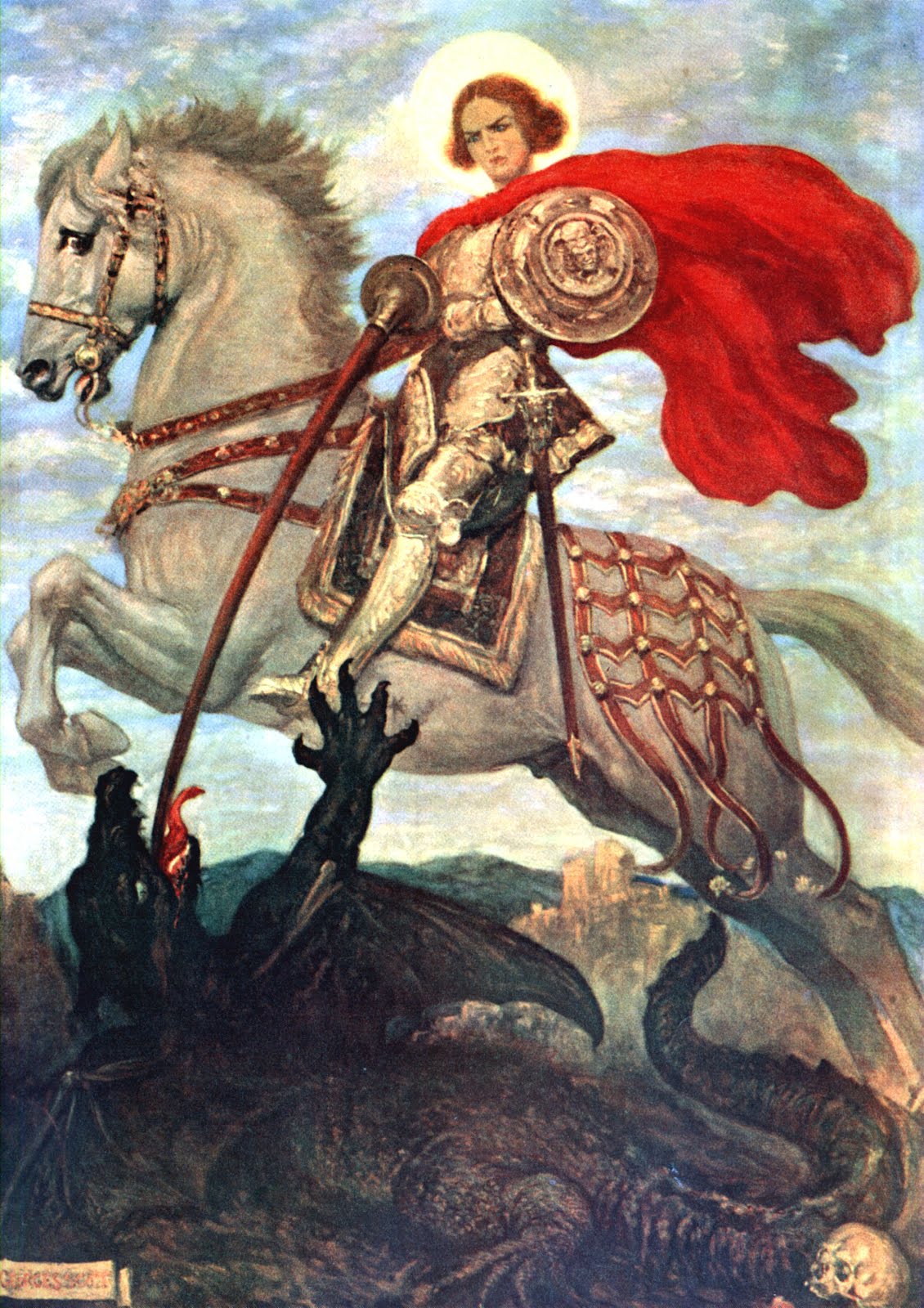 George, by George! - St George and a classical winged dragon, as painted by George ScottRunning to him in delight came the princess Alcyone, and once they had tied the girdle of her dress around the subdued dragon's neck they returned on horseback to her father's castle, leading the monster alongside George's mighty steed. There, in return for the knight's promise to slay the dragon, the overjoyed king and subjects of Silene willingly agreed to be baptized by him and thus be converted to the Christian faith. True to his word, George beheaded their onetime oppressor forthwith, and after bidding farewell to Alcyone her valorous deliverer rode away, into a future that would shortly transform him into a Christian martyr, and, many centuries later, into a certain race of medieval Crusaders' patron saint - thereafter to be known forever as St George of England.