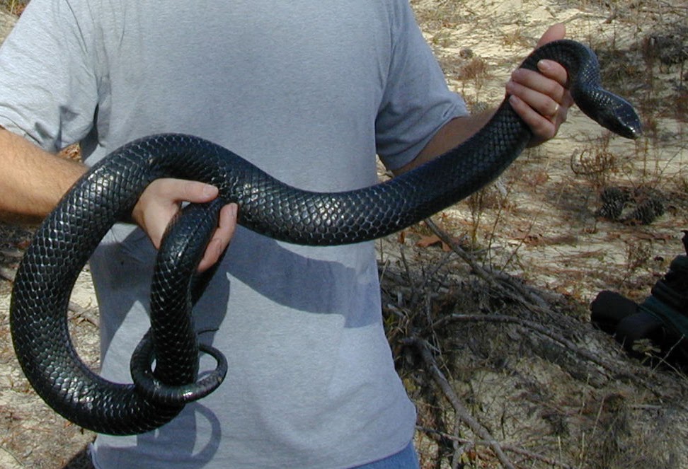 Did Hudson's ebony-scaled mystery snake look like this Eastern indigo snake?Then one day, after having stood there yet again, and for some considerable time, but still without success, Hudson became bored, and chose instead to interest himself in observing a bat hanging from a twig just overhead. Concentrating upon the bat, he at first paid no heed to a sensation of pressure upon the instep of his right foot, but when the pressure increased, until it seemed as if a heavy metal bar were resting upon it, he casually glanced down to see what was responsible for this sensation – and was shocked to discover that it was none other than his long-sought-after black mystery snake, which was actually drawing its lengthy inky-black coils leisurely across his foot!