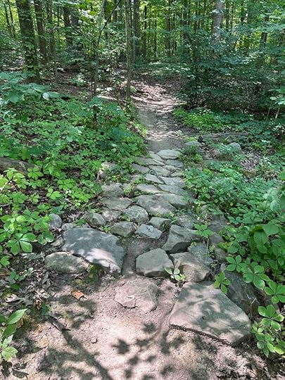Despite all the bugs we hiked for about a mile to the lake. The path was fairly narrow, really only big enough to walk single file. In some sections it narrowed so much that we were nearly walking through the brush on the side. There were a few inclines and descents and bridges to cross making it difficult for anyone with mobility or stability issues. It was mostly shaded and despite the mosquitoes a nice, peaceful walk in the woods.