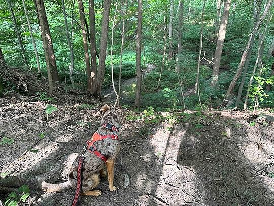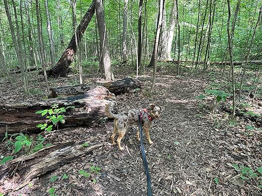 Hiking at Bicentennial WoodsWe visited Bicentennial Woods because although Karlie never hiked there she would have loved it. She loved any trail in the woods, but especially those that had water and the ability to get her toes in it. Bicentennial Woods has that so I know she would approve of our pick of a spot to celebrate her. Sunny had great fun snooping everything and especially enjoyed getting her feet in the water. We spent nearly an hour hiking 1.5M in the woods and explored the water in several areas. Sunny loved it and we encountered a few other people who also were enjoying their time in the woods.