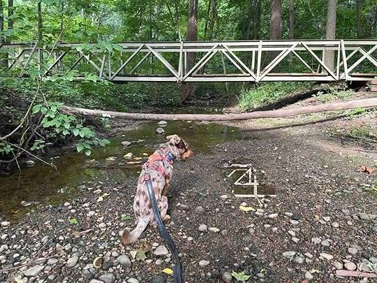 Most of the trail is flat, but there area a few sections with steep inclines and descents. Although the trail starts fairly wide, it narrows as it progresses. There is one section that is the land of the fallen and downed trees making for some interesting sites. There is also a small creek that runs through the woods with a bridge over it. Sunny enjoyed getting down to the water and putting her feet in it.