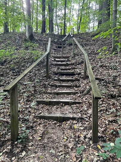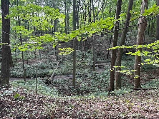 After winding around in the woods we came upon the canyon which is quite scenic. The trail traverses the top of the canyon and leads to a steep stairway that goes down into the canyon. The steps are quite steep and not recommended for anyone with stability or mobility issues. There seems to be a stream that runs through the canyon, but on our visit there was little to no water. We walked over the bridge and continued our exploration of the canyon. Eventually the trail returned to the stairs and took us back overlooking the canyon. We retraced our steps back toward the parking lot and found another trail that looped around near the parking lot. The total distance we walked was nearly 2M.