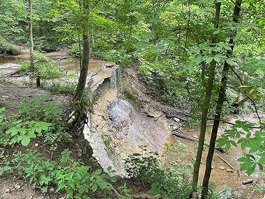 After parking in the lot off E 50 S, you can enter near the gate or the opening in the woods. We opted for the opening in the woods. Upon entering we found ourselves in a wooded wonderland with a tall forest of trees and bluffs above the Salamonie River. There are several trails in the woods marked by blue paint on tree trunks. We followed one that mostly traversed the bluffs above the Salamonie River. We passed a covered picnic area, a small shed, downed trees, and eventually found ourselves above Kissing Falls. It was truly beautiful and since we had rain a few days prior the falls were active. The distance to the falls is about 1.6M and it is a bit of a challenging hike as there are some inclines and descents. The trail is relatively narrow and dirt, stone, or grass covered. There are other trails and waterfalls which we plan to investigate on future trips to this wonderful preserve.