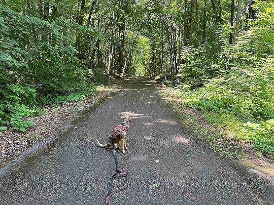 Although the Pufferbelly Trail is quite nice, the walk from the parking lot to the connector trail and along the connector trail is not too scenic. It’s more of a city walk, but once you turn off the connector trail onto the Pufferbelly Trail you feel more like you are in the woods. We took a right at the end of the connector trail onto the Pufferbelly Trail. Then we walked to W. Jacobs Ave and back for a total of nearly 4M. The trail is asphalt and quite wide making it great for bikes and those with mobility issues. We encountered wild flowers, Spy Run Creek, and a park near an apartment complex. We were even able to get down to Spy Run Creek, which Sunny loved.