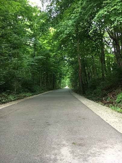 View of the path on the Limestone GreenwayThe Karst Farm Greenway is located off N. Loesch Road and is a nearly 4.5 mile trail. There is a parking area off Loesch Road, but it can only accommodate two vehicles. The trail is asphalt and runs alongside the road. There are trees between the path and road, but it’s not as scenic at the other trails. This was our least favorite trail.