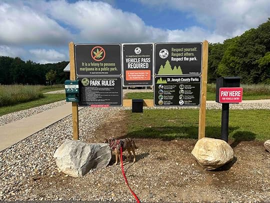 Our RatingSunny and I rate the Pumpkinvine Trail 3 out of 4 paws up. It’s a nice trail that is good no matter your mobility. It’s wide giving bikes and other people plenty of room to pass. There is also a lot of grass on the side so it’s easy to step off the trail and give people additional room. We especially liked the views of the woods and the creek. This is a great place for a bike ride, run, or hike. The added bonus is Abshire Park that has both restrooms and benches so you can stop for a rest or even a picnic. We recommend the Pumpkinvie Trail if you live near Goshen or if you are looking for a trail that won’t be muddy.