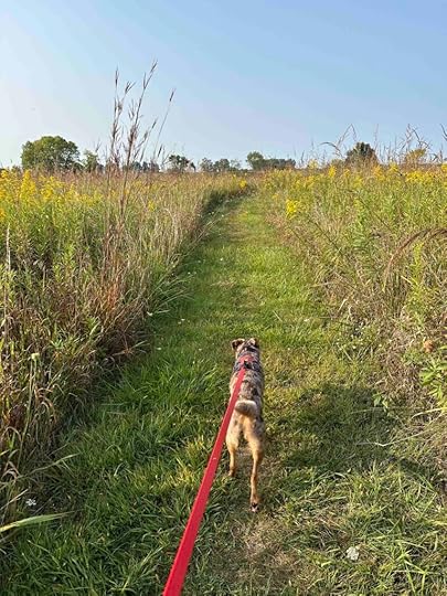 Our AdventureWe started by walking along the asphalt trail that passes the port-o-potty and turned left on the first section of the Payton Park Loop. This led us through an area with woods on both sides and to the Pufferbelly Trail. On our previous visit we turned right, but today we turned to the left. As we walked the woods gave way to fields and houses on either side. How lucky are the people who live behind this trail and can walk on it every day? We saw many trails from the back of homes to the trail. One family even set up a snack station for walkers and runners. Sunny enjoyed snooping as she heard they had dog treats and was trying to find them.
