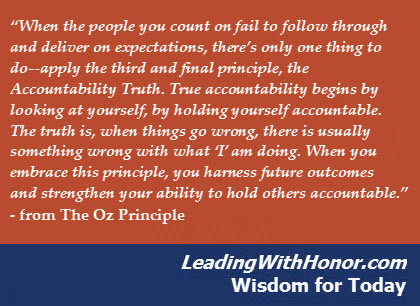 “When the people you count on fail to follow through and deliver on expectations, there’s only one thing to do—apply the third and final principle, the Accountability Truth. True accountability begins by looking at yourself, by holding yourself accountable. The truth is, when things go wrong, there is usually something wrong with what ‘I’ am doing. When you embrace this principle, you harness future outcomes and strengthen your ability to hold others accountable.” – from The Oz Principle