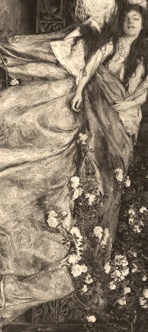 And still the princess and the court slept on. Many princes and brave knights came to the hedge, having heard the story of the sleeping beauty who lay within under an enchantment. They tried with all their might to get through the hedge, but when they had cut through part of the way, the thorns would close about them and hold them fast. One after another these brave young men died a lonely and miserable death. The years passed. The thorn hedge withered and crumbled to dust, and the sleeping court turned to stone. Then a young traveler passed that way, a gatherer of stories and tales. He explored the silent palace, gazing in wonder at the stone statues of sleeping men and women. At last he climbed to the uppermost room in the tallest tower, where he found, beneath a thick canopy of cobwebs, the bed in which lay the sleeping princess. She alone in all the palace had not changed. Her skin was pale but glowed with life, her lips were red as ripe cherries, and her long, shining hair lay draped about her like a golden mantle. The traveler was moved to pity by the sight of this beautiful young woman alone in that desolate place. But he knew he was not the one meant to wake her. For he was a servant of the fathomless fire, and he saw that the young woman's story had been broken and devoured, like so many others, by the enemy he had pledged his life to defeat. But he could not leave the girl there, so he brought her back with him to his own country, and in the city where he lived, which was called Fable, she was placed in a soft silken bed and tended with care, in the hope that a way would someday be found to wake her. After a time those who cared for her noticed that whenever danger threatened the city, the princess would stir uneasily in her slumber, and mumble vague words of distress. So it was that the people of that city discovered that they had no more vigilant guardian than this sleeping girl.