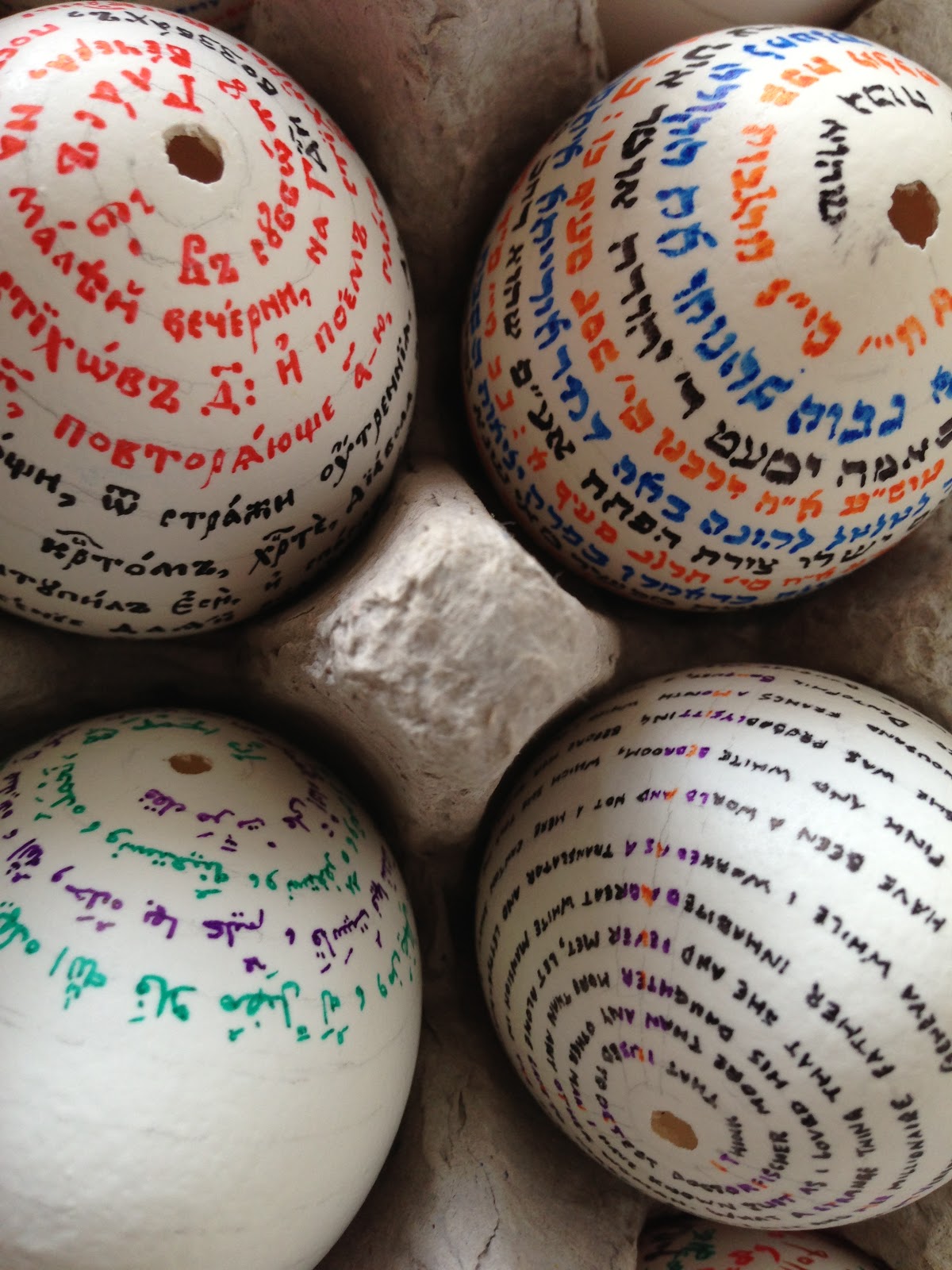 Another student developed his own imaginary script, based on the fanciful notion that squid communicate by way of the shapes they can make with their ink in the water. And as if that wasn't enough, he honed his understanding and facility with script-making by copying out passages from various texts in various scripts (Hebrew, Arabic, English, etc) on the shells of eggs.