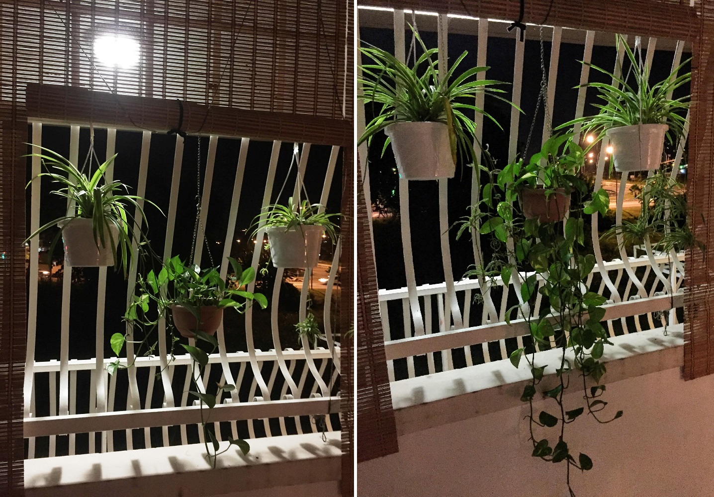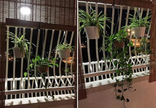 Spider plants and pothos newly hung and 3-4 months laterI'm focusing on easy care plants in the apartment and on the balcony these days and these two stalwarts absolutely fit the bill.