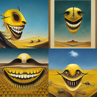 Anyway, no one wanted to buy it. Which led me back to Midjourney's AI to do some more playing. I figured this time I'd better, you know, add some more realism to the cover other than a freaky yellow bug-thing. So, at the top of this post, and right below, is the latest attempt. I think it's more grounded but also has that bizarre, creepy feel with that big bug eye.