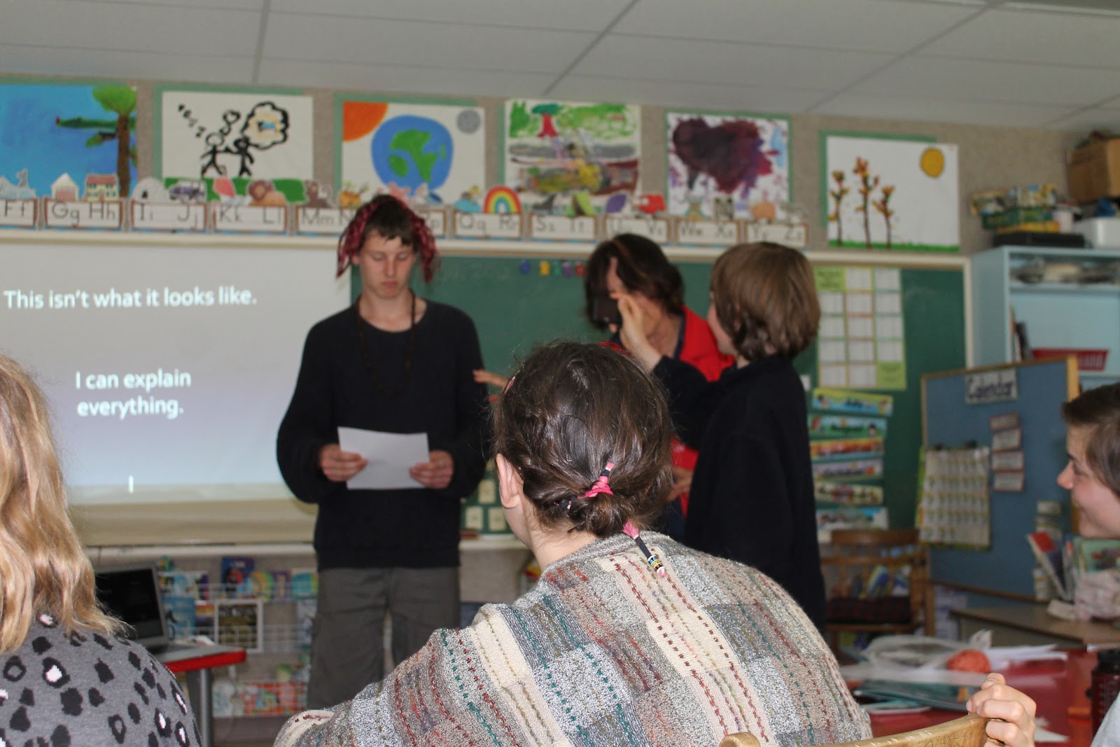 On this day they learned about writing process instead. On the fly, feather and paint chip simile creation as well as reading script drew some great volunteers. For a change we had two young men play the parts of Sunny, usually a girl, and Cole. Note the red hair extensions and coffee bean necklaces to help get the young man into character.